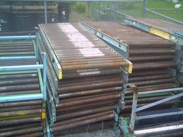 Unused and used heavy duty gravity roller sections. Some motorized sections for $1000.00 ea. See all attached pictures. Subject to stock on hand. Save big money on each section over comparable new sections. Some are 10 ft. long and some pieces are only 6 ft. long. Various widths. Some used, some unused. Both solid rollers and roller skate type available. Also ask about motorized sections and corners.