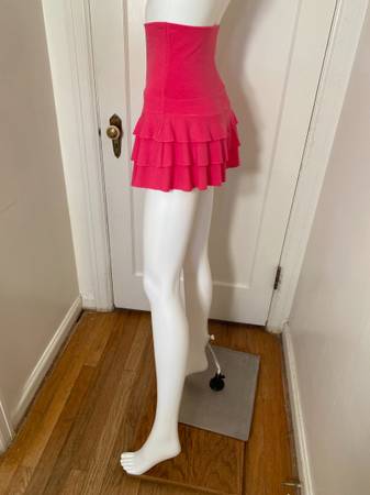 NEW! Pink ruffle mini skirt. Stretchy fabric. Item may also be found on POSHMARK and Mercari under Neiman Capital to purchase and to ship. We do not respond to emails