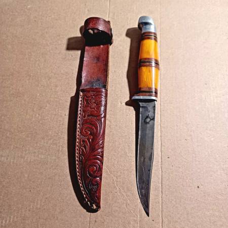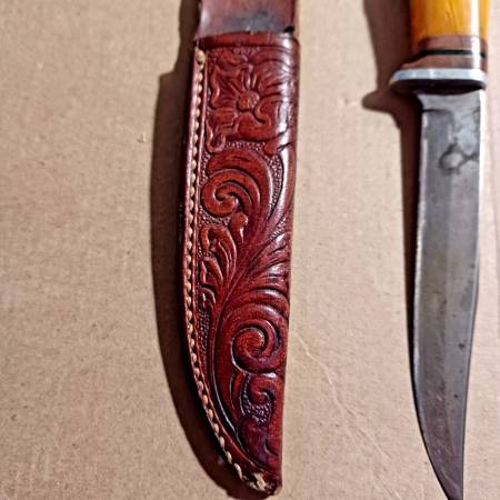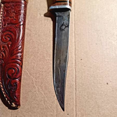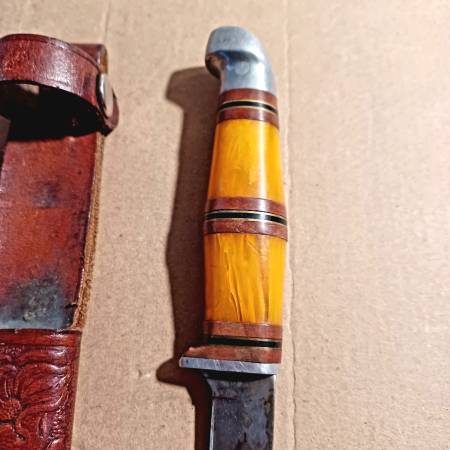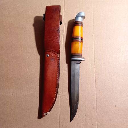 Old Shapleigh Knife. From St Louis Mo. I think the handle is bakelite? There is a small hole in the Knife Sheath. See pictures. Thanks for looking. Pick up in Firth. Cash only. No holds.