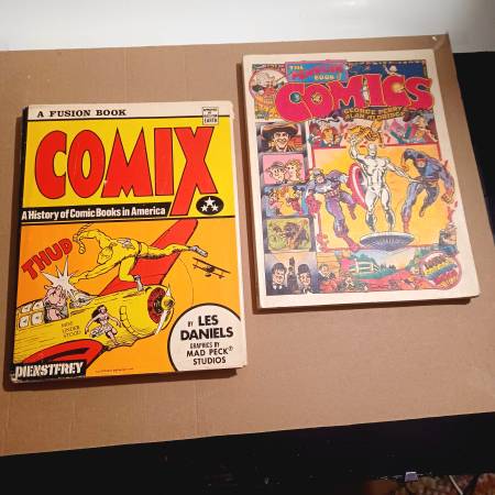 Vintage Pair on Comic Books. Hardback 1971 w/Dust Jacket. Les Daniel's Comix Illustrated. And Softcover Illustrated Penguin Book of Comics. Perry and Aldridge. 1971. Both in very good condition. Thanks for looking. Pick up in Firth. Cash only. No holds.