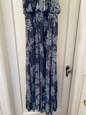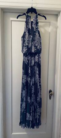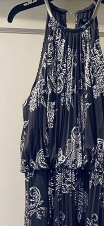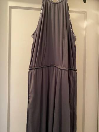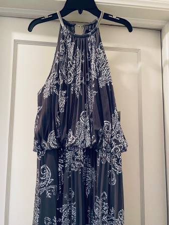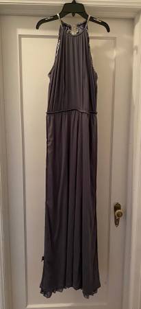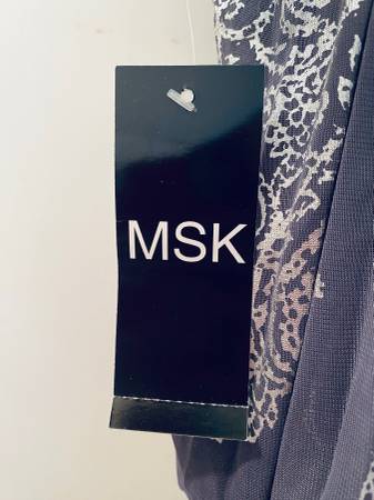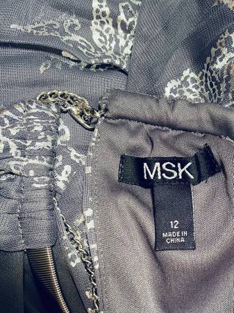DESIGNER MSK beautifully pleated, grey and silver dress with silver metal necklace. Dress is lined with an elastic waist for slip-on. Size 12 NEW! With tag. We do not respond to emails.