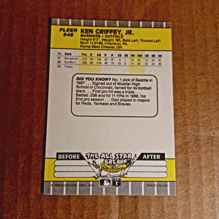Mariners Ken Griffey Baseball Trading Card. #548 1989. In very good condition. Great Card, Great Player. Thanks for looking. Pick up in Firth. Cash only. No holds.
