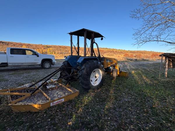 Older Long tractor. Includes front end loader, mower, blade, rake, and bail spears. Runs good Needs alternator and has a small air leak in the fuel system, so the injectors need to be bled if it...