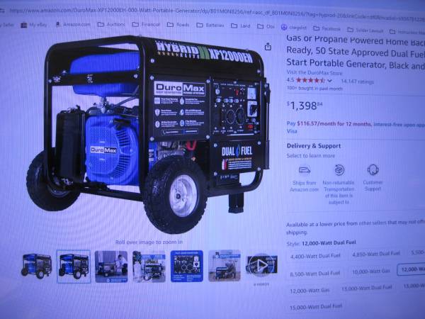 For sale is a new, in the box Duromax XP12000EH generator. It will run on gas or propane. Save $ hundreds--Amazon is asking $1484 with tax. Asking $1100 or best offer. Call