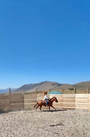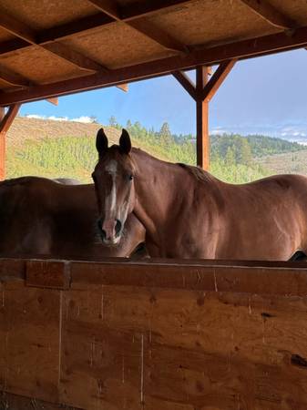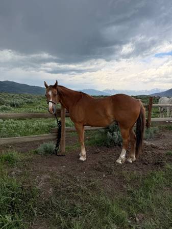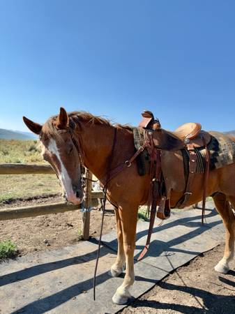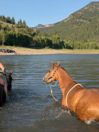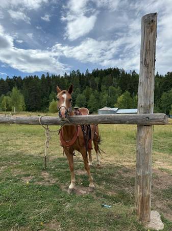 Easy to catch, Easy keeper, ties, trailers, no buck, kick or rear. Trail rides well enough, needs more miles but he’ll follow along just fine. Haven’t done much arena work, but he seems to collect himself nicely enough. Working on his stop. I will say he’s not a kids horse or a beginners horse, when I got him this spring he’d been sitting for who knows how long. I’d say with more time he could get along with anybody, but for now he needs someone with more experience. He’s buddy sour but can ride out alone. It won’t be that enjoyable for a little while but you can get it done if you’re confident enough. He gets along well with mares or geldings but not both together, he’ll push around a week gelding or constantly battle another alpha gelding. He requires drugs when shoeing. I’ve had a packsaddle on him once, but never actually packed with him, but he’s felt all the rigging. He still nervous, needs more confidence but he has potential if you have the time. $2,000 to the right home.