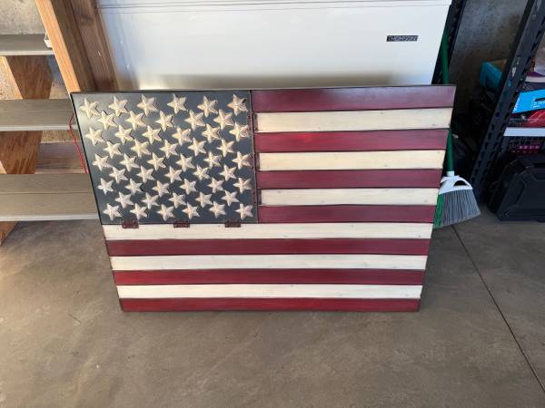 American flag, great for a garage and or man cave, even looks great over a fire place. 36” wide and 26” tall. Easiest if you reach out by text