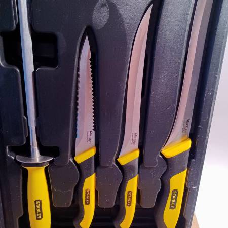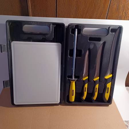 Brand New! Stanley Max-Edge Stainless Steel Knife Set with Case. Comes with a Cutting Board and Case. Great Camping Set. Thanks for looking. Pick up in Firth. Cash only. No holds .