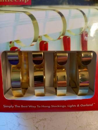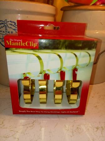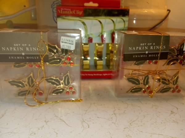 The original 4 Brass Mantle Clips for hanging Stockings, Lights and Garland. And a set of 8 Christmas Enamel Holly Napkin Rings. They are beautiful. Thanks for looking. Pick up in Firth. Cash only....