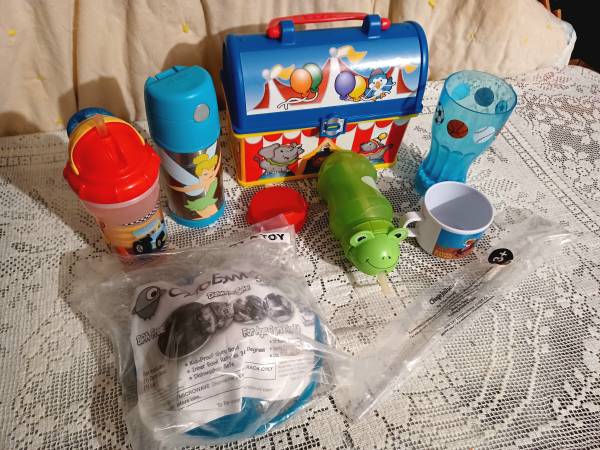 Children's non Spill Gyro Bowl, (new)Tinkerbell Thermos Cup, Fisher Price Circus Lunchbox, Lite up Sports Tumbler Straw (new) and a Nuby and Cool Gear Non Spill Travel Tumblers. All in very good condition. Great fun for the kid's. Thanks for looking . Pick up in Firth. Cash only. No holds.