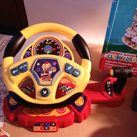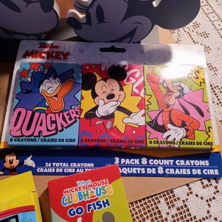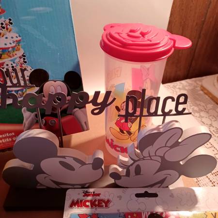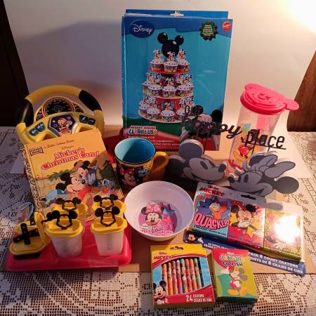 Disney Mickey and Minnie Mouse Collection . Happy Place Plaque, Cupcake Stand Kit, Little Golden Book 1996, Crayons(4)Sets, Go Fish Card Game, Popsicle Molds (4), Mug and Cereal Bowl, Covered Tumbler and A Battery operated Toy Steering Wheel. All in very good condition. Thanks for looking. Pick up in Firth. Cash only. No holds.
