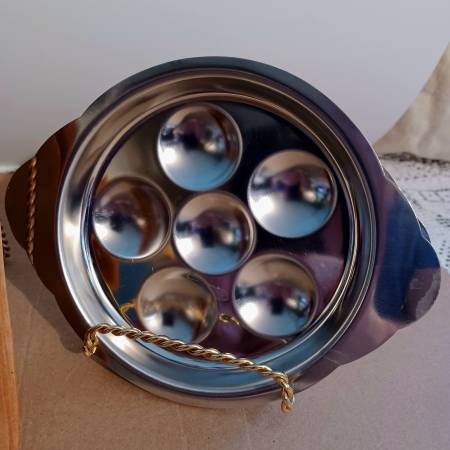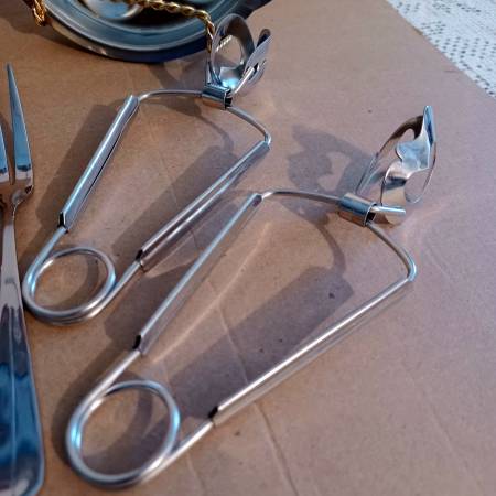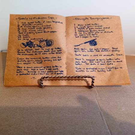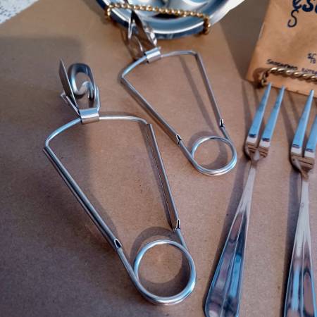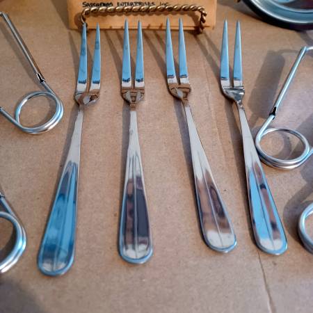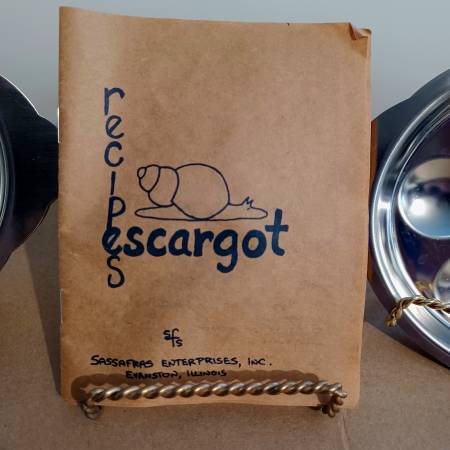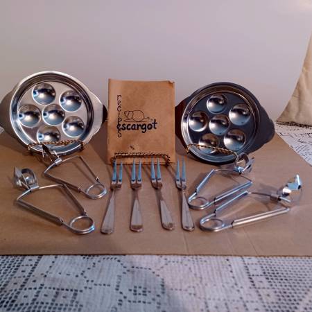 Escargot Snail Set. 4 Stainless Steel Baking Dishes, 4 Tongs, 4 Forks Plus Recipe Instruction Booklet Sassafras 1979. Thanks for looking. Pick up in Firth. Cash only. No holds.