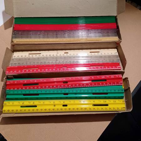 Tru Bilt. The only accurate 12 inch plastic ruler. Accurate, rigid, lightweight, strong. Red, yellow, green, clear and cream. The 1 box is full and a few missing from the other box. Enough for your whole class room. Thanks for looking. Pick up in Firth. Cash only. No holds.