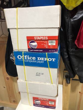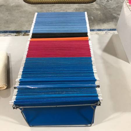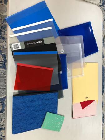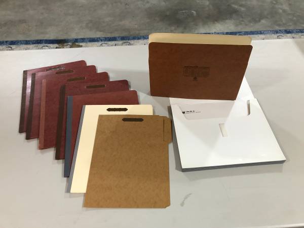 Variety of Office Equipment and Supplies. Buy all for $150. Includes 1 four drawer legal file cabinet, 1 hanging file rack, lots of colored hanging legal and letter file folders with tabs, Cork tiles, variety of other office supplies and paper, a therapeutic seat, etc. shown.
