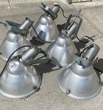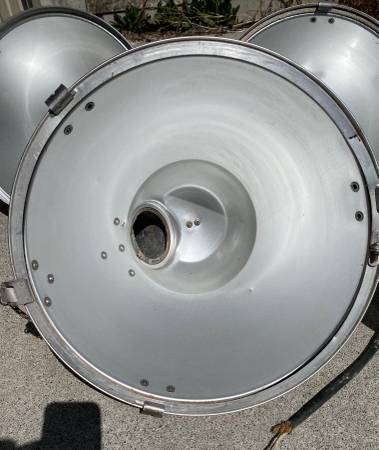 drive in vintage Flood light cones. Aluminum and strong metal! five for $500 obo Measurements: cones 19”W x 14”H Cones with attachments 19”H We do not respond to emails
