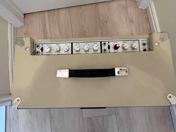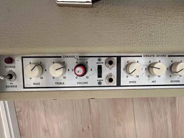 This combo amp is equipped with two separate channels. Each channel has volume, bass, and treble controls as well as bright and dark switches, and separate high and low inputs. Channel one also has a push/pull control on top of the volume knob that functions as a distortion /gain control for channel one. The effects section has a vibrato speed and intensity control as well as a reverb control. These are actuated by on/off pedals plugged into the input jacks at the bottom back of the cabinet. The required pedals can be generic standard switching pedals with ¼” jacks. Please note, no pedals will be included in the sale. There is a switch at the bottom rear of the cabinet labeled as live/damped room eq. There are two other jacks at the rear bottom of the cabinet labeled bass and treble. (We do not know if these are inputs or outputs, but guessing they are outputs. We did not test them). All other controls, switches, and connection jacks function as intended with no noise. The a.c. power cable is grounded. The on/off switch can be reversed for polarity problems.