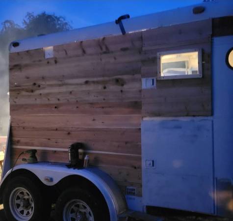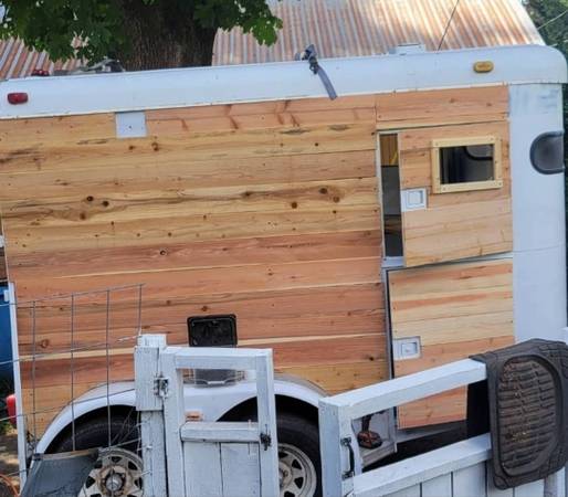 Circle J horse trailer Bar/Food Event. Bought this trailer to turn into a mobile bar for weddings. Still currently working on it and will continue until purchased. Inside is being done with clear vertical cedar planks. Sink is in and working on hooking up the water. Fresh water tank was salvaged from a travel trailer. Installing live edge bar top today. Was planning on using a generator but have electrical things I will include in the sale. There is not a back gate currently (was going to do saloon type doors) although we built a temporary one for while we work on it. You will need magnetic tow lights since the electric isnt done. No title but have bill of sale. Price will go up as work continues.