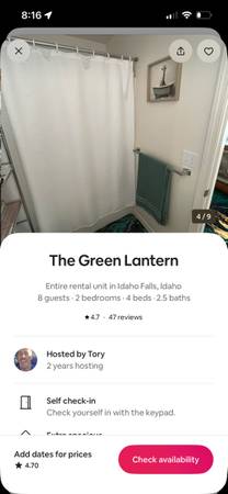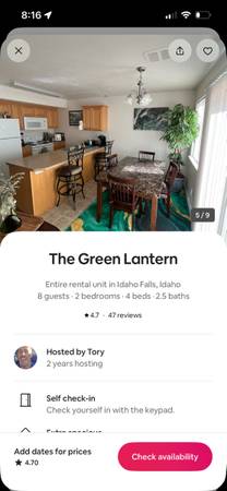Message to reserve. Also on Airbnb and Vrbo under “The Green Lantern”. Dynamic pricing. Fantastic stay. Wi-Fi available.